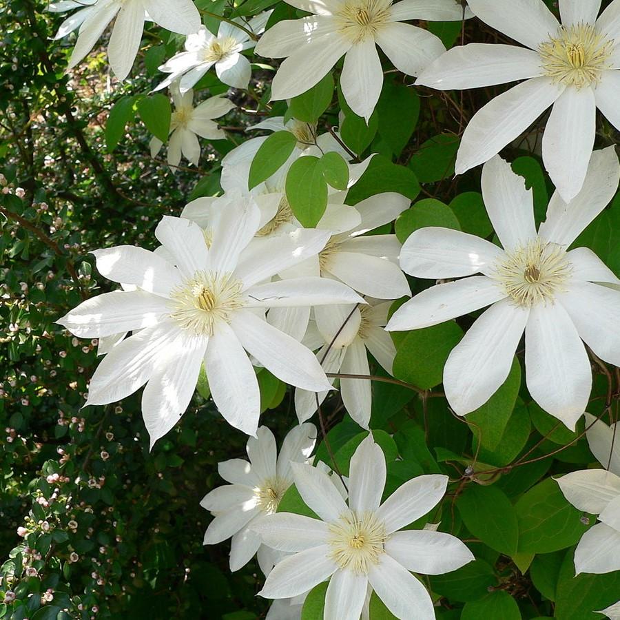 Henryi Clematis is a large vigorous deciduous climbing perennial vine with bright green foliage that flowers on both new and old wood. The large white flowers with dark anthers bloom through summer first heavily on old wood than again on new wood. Prefers full sun and moist well-drained soil. Needs support.